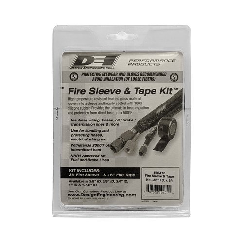 Fire Sleeve solves the problem of heat and abrasions damaging fuel, transmission and brake lines and is a fireproof solution. Constructed from a high temperature resistant braided glass material, woven into a sleeve and heavily coated with 100% iron oxide silicone rubber, Fire Sleeve thermal insulator sleeve provides the ultimate in heat insulation and protection from direct heat up to 500F. Includes a 16-inch length of black Fire Tape, an adhesive-free, self-a dhering tape, to finish off ends of Fire Sleeve or when joining two Fire Sleeves together while presenting a clean and professional look. Insulates wiring, hoses, oil / brakes / transmission lines & more Use for bundling & protecting hoses, electrical wiring, etc. Withstands 2000F of intermittent heat Includes 16 inches of black Fire Tape Size: 0.375 (3/8) inch x 36 inches
