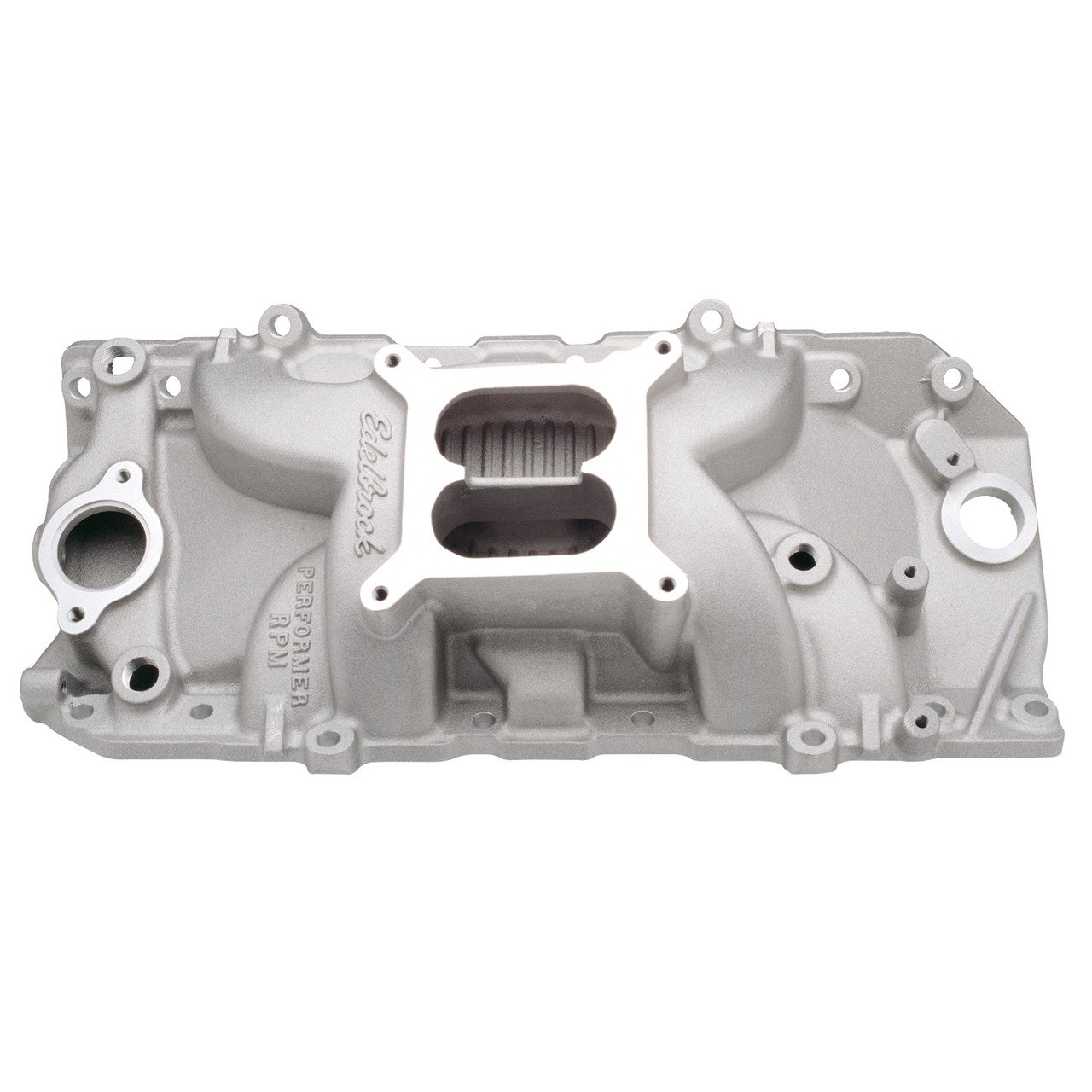 Edelbrock part #7161 Performer RPM 2-O intake manifold is designed for street 396-502 c.i.d. Chevy V8’s with large oval-port cylinder heads (1975 and earlier). This dual-plane high rise intake manifold delivers outstanding horsepower while maintaining good torque and driveability. No provisions for exhaust heated chokes. Accepts late-model waterneck, air-conditioning, alternator and HEI equipment.