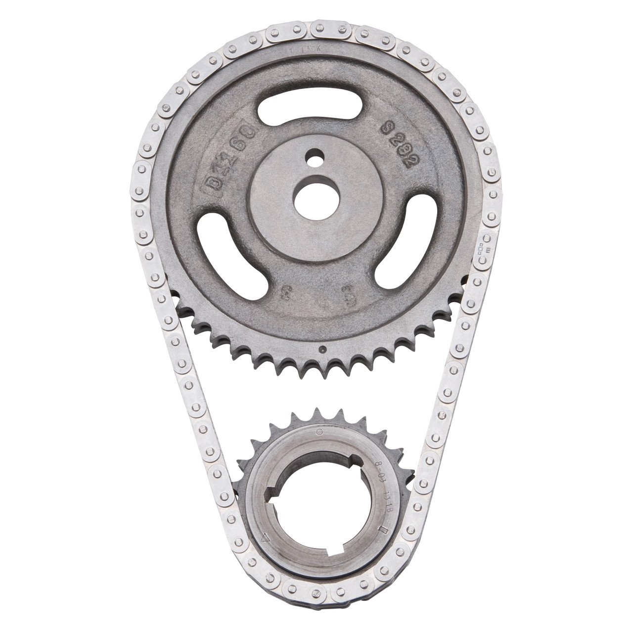 Edelbrock part #7813 Performer-Link timing chain is for use with Edelbrock or stock cams. They have a solid-bushing chain for a true bearing surface that rolls with the sprockets, eliminating chain stretch. Cam sprockets are made from 35,000 psi tensile strength cast iron. Crank sprockets are made from billet SAE-1144 steel and induction heat treated. Four Performer-Link sets are stock replacement parts and 50-state legal (see listings in bold type). All other sets have three keyway setting points to ensure accurate timing selection for early or late-model vehicles. Performer-Link timing sets are not for use above 6500 rpm. Performer roller chain sets are engineered to operate up to 6500 rpm. Never hammer directly on chain or sprockets. You can crack the hardened links and pins and cause early failures. Use a sleeve for installations that require hammering, a brass drift punch may be used if you carefully alternate blows on either side of the sprocket to avoid cocking. Never stretch the chain with a screwdriver. Check for clearance between the timing chain and block and between the chain and front cover before reassembly. Be sure that both cam and crank sprockets are exactly in line with each other. Misalignment can cause chain to break.