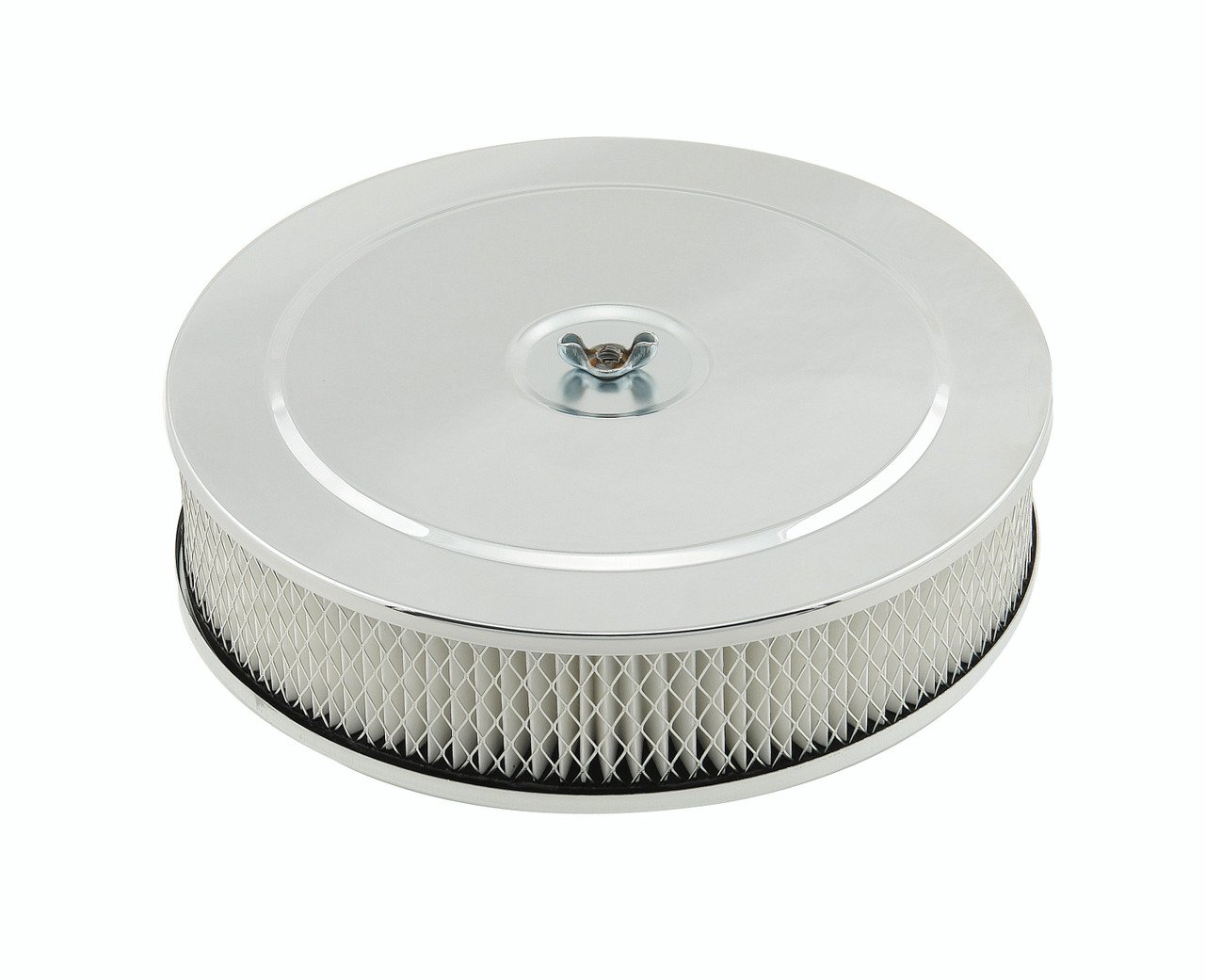 This Mr. Gasket Air Cleaner has chrome plated steel top and base. Has a high CFM replaceable flame retardant paper element. Also includes carburetor air cleaner stud and wing nut. Fits most 2,3 and 4-barrel carburetors with a 5-1/8 inch neck.
