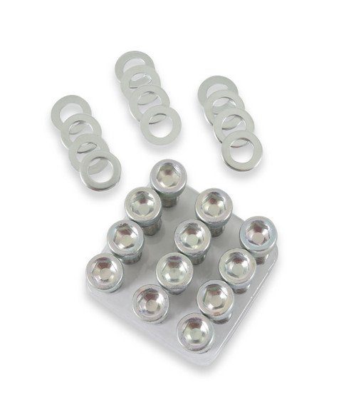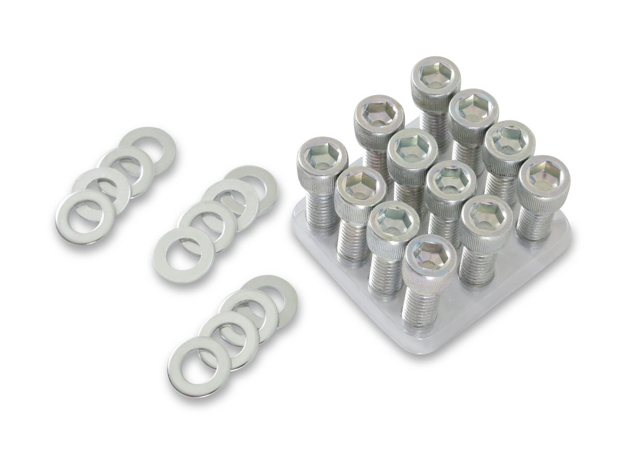 These grade 5 hex head bolts are brite zinc plated for protection and appearance. Hardened flat washers provide uniform torque & prevent galling on aluminum manifolds. Includes twelve (12) 3/8 inch-16 x 1 inch bolts & washers