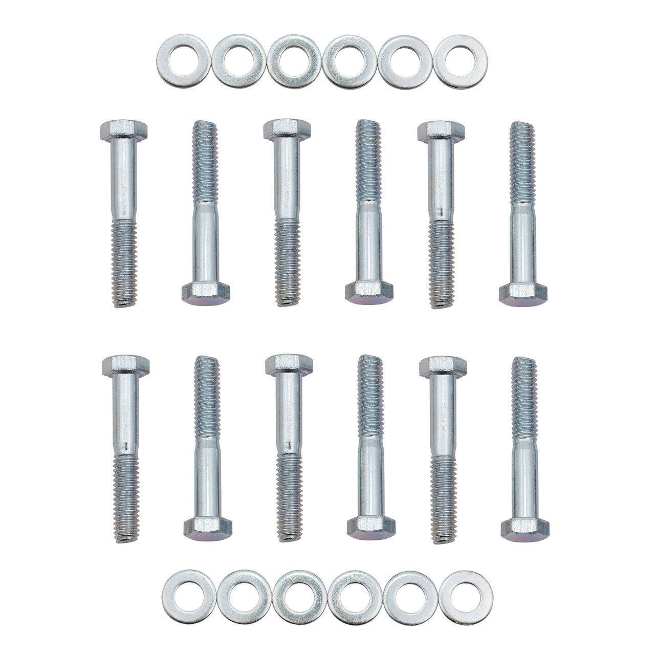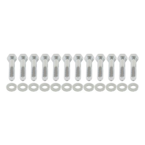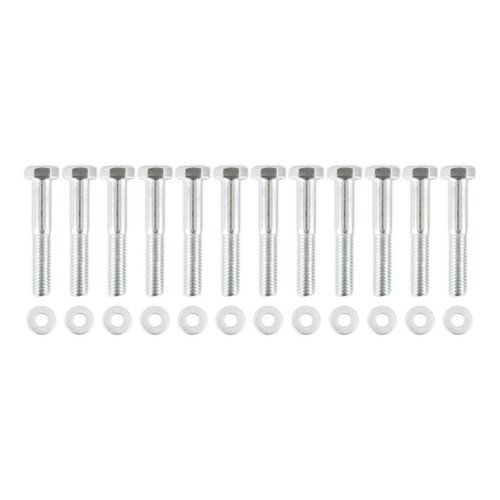 These grade 5 hex head bolts are brite zinc plated for protection and appearance. Hardened flat washers provide uniform torque & prevent galling on aluminum manifolds. Includes twelve (12) 5/16 inch-18 x 2 inch bolts & washers