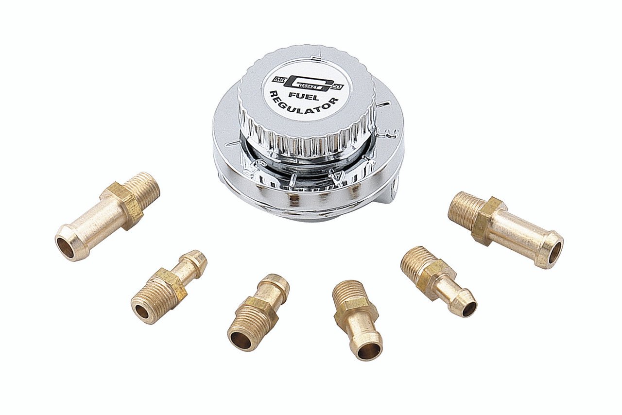 Adjustable from 1-6 PSI (pounds per square inch) it includes brass fittings for use with 1/4 inch, 5/16 inch, or 3/8 inch fuel hose. For use with carburetor fuel systems only & engines not exceeding 400 horsepower. Select desired pressure settings via selector knob located on top of regulator. 2-1/4 inch diameter chrome plated body.
